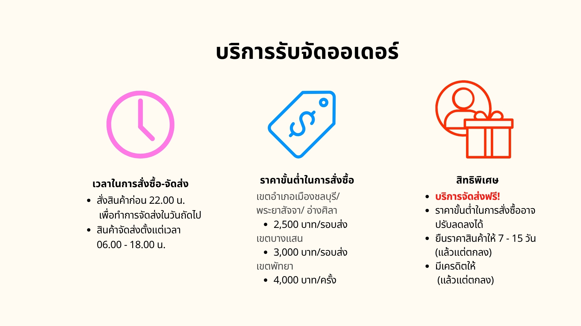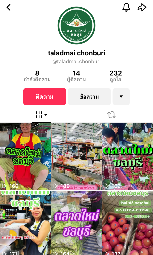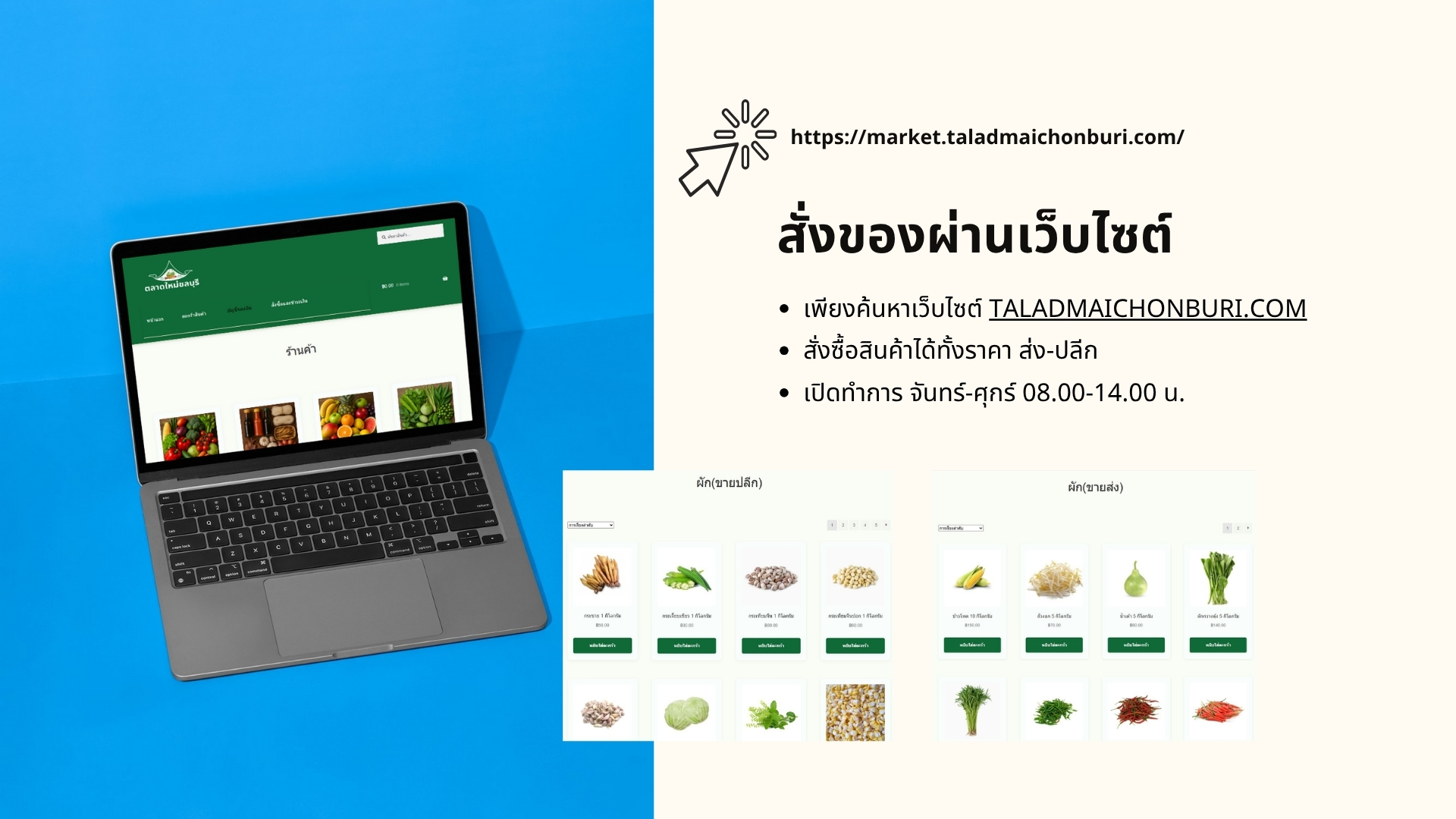 ทำไมต้องตลาดใหม่ชลบุรี? ทำเลใจกลางเมือง อยู่ใจกลางเมืองและชุมชนของจังหวัดชลบุรี เดินทางสะดวก ใกล้ถนนสายหลัก และโครงการสำคัญ สด สะอาด ได้มาตรฐาน สินค้าเกษตรกร อาหารสด ผัก ผลไม้ ของแห้งและสินค้าแปรรูปคุณภาพดีด้วยมาตรฐานและราคาถูก อยู่มานานกว่า 30 ปี สร้างความมั่นใจทางธุรกิจมานานกว่า 30 ปี ที่โดดเด่นด้านคุณภาพบริการสินค้าหลากหลายและราคาถูก เปิดขาย 24 ชม. เปิดขายสินค้า 24 ชม. มีทีมงานคอยดูแลในเวลาทำการ สถิติของ ตลาดใหม่ชลบุรี พื้นที่ตลาดรวม 0 ไร่ สินค้าหมุนเวียน 0 ตัน จำนวนผู้มาใช้บริการ 0 คน ที่จอดรถ 0 คัน Facebook Youtube Tiktok ตลาดใหม่ชลบุรี